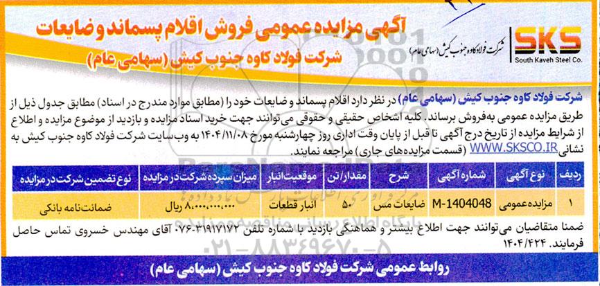 شرکت فولاد کاوه جنوب کیش (سهامی عام) در نظر دارد اقلام پسماند و ضایعات خود را مطابق موارد مندرج در اسناد مطابق جدول ذیل از طریق مزایده عمومی به فروش برساند .کلیه اشخاص حقیقی و حقوقی میتوانند جهت خرید اسناد مزایده و بازدید از موضوع مزایده و اطلاع از شرایط مزایده از تاریخ درج آگهی تا قبل از پایان وقت اداری روز چهارشنبه مورخ 1404.11.08 به وب سایت شرکت فولاد کاوه جنوب کیش به نشانی WWW.SKSCO.IR قسمت مزایده های جاری مراجعه نمایند.