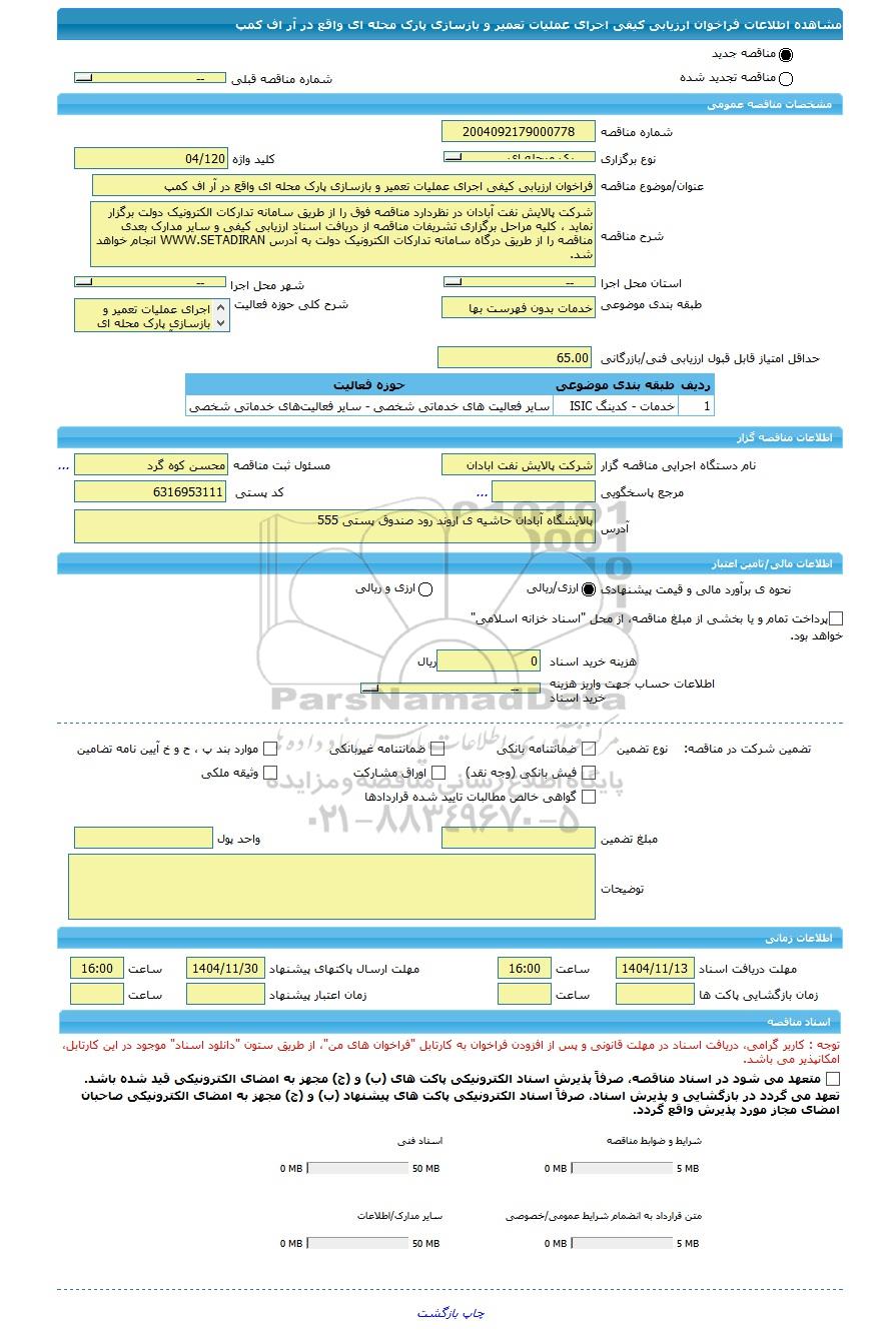 | عنوان/موضوع مناقصه | فراخوان ارزیابی کیفی اجرای عملیات تعمیر و بازسازی پارک محله ای واقع در آر اف کمپ | ||||||||
