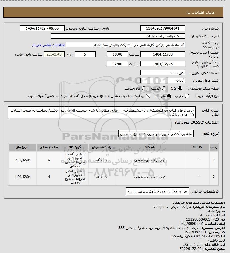 شرح کلی نیاز: خرید 2 قلم کباب زن اتوماتیک/ ارائه پیشنهاد فنی و مالی مطابق با شرح پیوست الزامی می باشد/ پرداخت به صورت اعتباری 45 روز می باشد