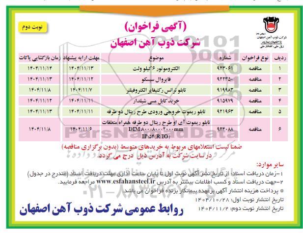| 3 | مناقصه | 919983 | تابلو ترانس رکتیفایر الکتروفیلتر | 1404.11.7 | 1404.11.8 |