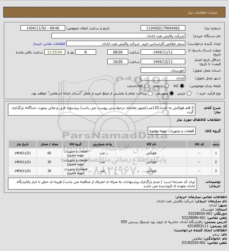 شرح کلی نیاز: 3 قلم هواکش به تعداد 120عدد/تصویر تقاضای درخواستی پیوست می باشد/ پیشنهاد فنی و مالی بصورت جداگانه بارگذاری گردد