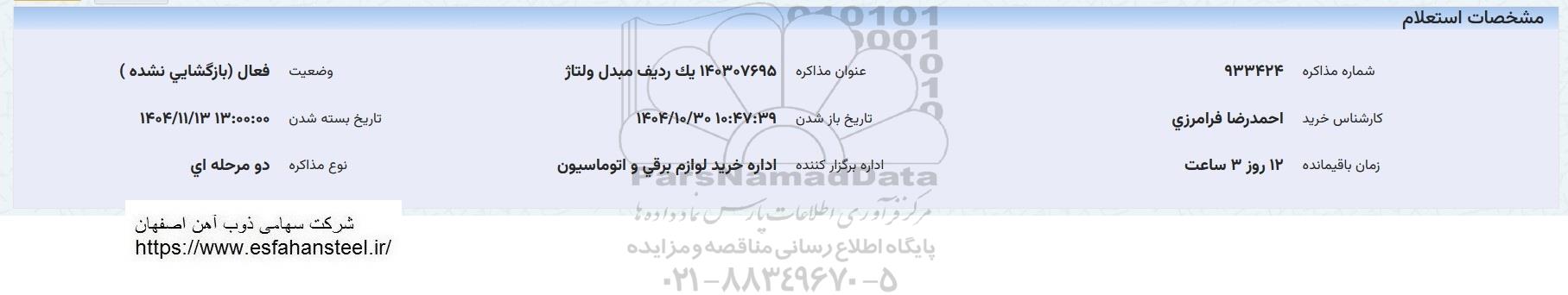 استعلام بها و موضوع استعلام استعلام یک ردیف مبدل ولتاژ به اطلاع کلیه شرکت‌ها و افراد متخصص واجد شرایط می‌رساند، آگهی گذار در نظر دارد از طریق استعلام بها، نسبت به انتخاب و دریافت پیشنهادات اقدام نماید. این استعلام با کد آگهی ثبت شده در سامانه خبرگزاری پارس نماد : 10175398 منتشر شده است. مشخصات استعلام : تاریخ شروع استعلام: 1404/11/01 آخرین مهلت ارسال پیشنهاد قیمت : 1404/11/13 و محل اجرای پروژه : استان مناقصات استان اصفهان میباشد. استعلام قیمت مورد درخواست : استعلام یک ردیف مبدل ولتاژ با دسته‌بندی‌های تخصصی و گروه های مرتبط : ساخت،نصب و تعمیرات صنایع فولاد, تجهیزات و ماشین آلات صنعتی, تجهیزات برق و الکترونیک, استعلام اطلاع رسانی میگردد.