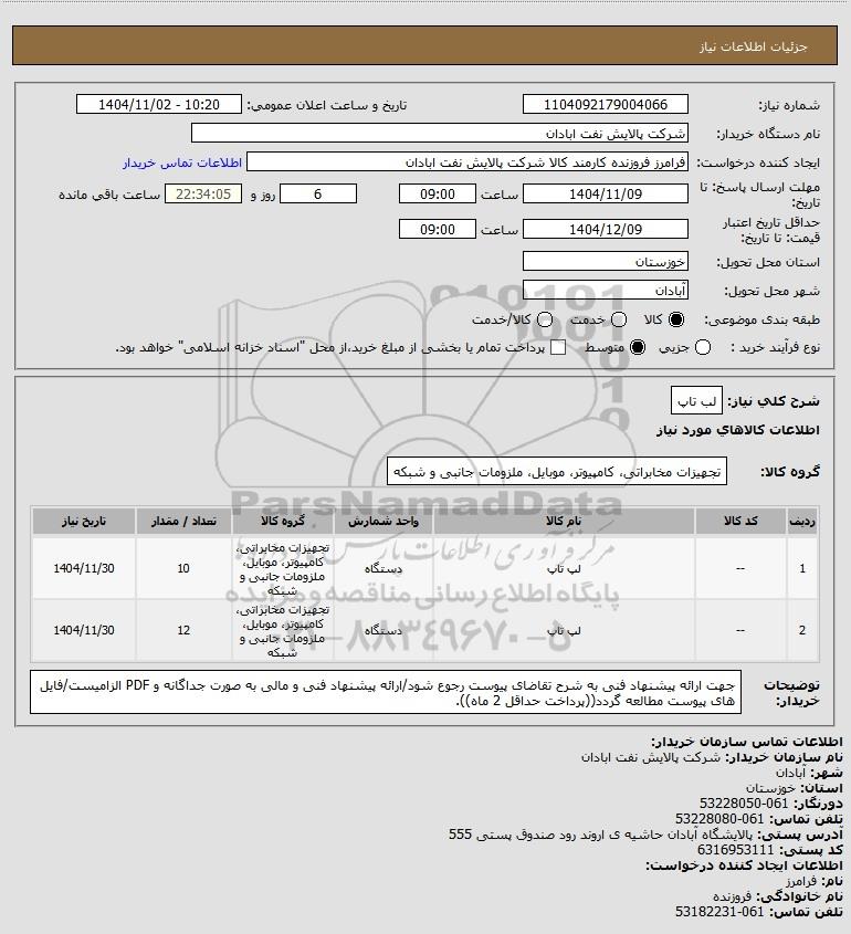 1 -- لپ تاپ دستگاه تجهیزات مخابراتی، کامپیوتر، موبایل، ملزومات جانبی و شبکه 10 1404/11/30