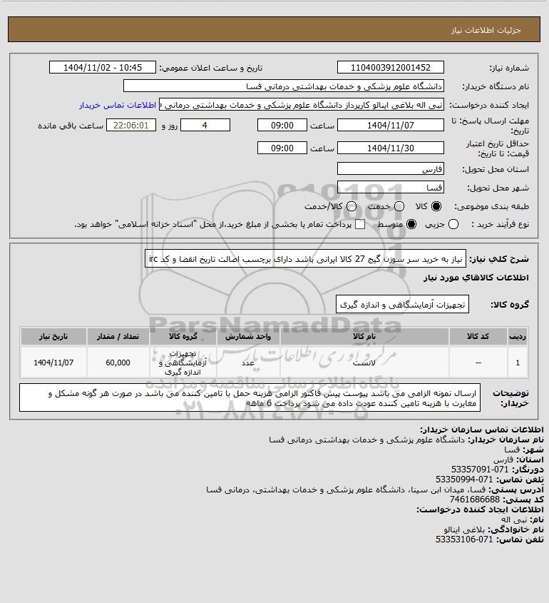 شرح کلی نیاز: نیاز به خرید سر سوزن گیج 27