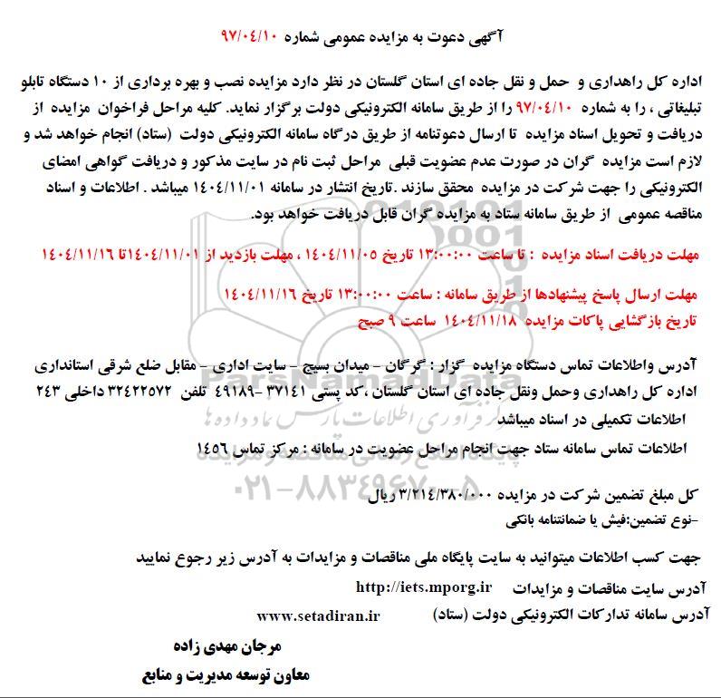 اداره کل راهداری و حمل و نقل جاده ای استان گلستان در نظر دارد مزایده نصب و بهره برداری از 10 دستگاه تابلو تبلیغاتی، را به شماره 97/04/10 را از طریق سامانه الکترونیکی دولت برگزار نماید. کلیه مراحل فراخوان مزایده از