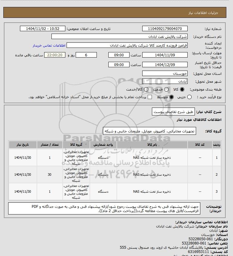 | 3 | -- | ذخیره ساز تحت شبکه NAS | دستگاه | تجهیزات مخابراتی، کامپیوتر، موبایل، ملزومات جانبی و شبکه | 1 | 1404/11/30 |
