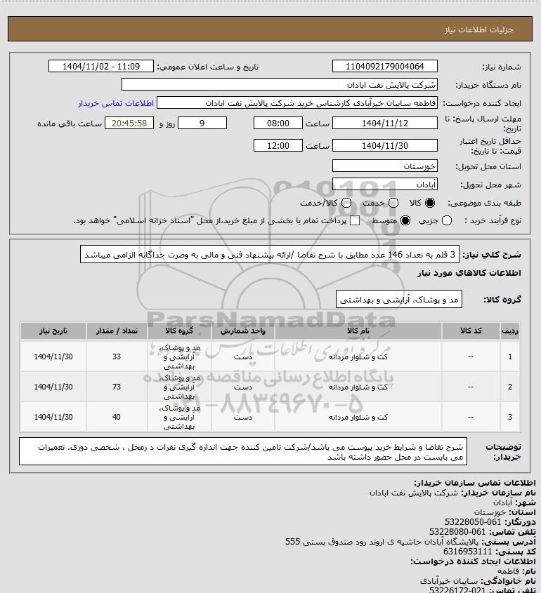 استعلام بها و موضوع استعلام استعلام 3 قلم به تعداد 146 عدد مطابق با شرح تقاضا /ارائه پیشنهاد فنی و مالی به وصرت جداگانه الزامی میباشد به اطلاع کلیه شرکتها و افراد متخصص واجد شرایط میرساند، آگهی گذار در نظر دارد از طریق استعلام بها، نسبت به انتخاب و دریافت پیشنهادات اقدام نماید. این استعلام با کد آگهی ثبت شده در سامانه خبرگزاری پارس نماد : 10175787 منتشر شده است. مشخصات استعلام : تاریخ شروع استعلام: 1404/11/02 آخرین مهلت ارسال پیشنهاد قیمت : 1404/11/12 و محل اجرای پروژه : استان مناقصات استان خوزستان میباشد. استعلام قیمت مورد درخواست : استعلام 3 قلم به تعداد 146 عدد مطابق با شرح تقاضا /ارائه پیشنهاد فنی و مالی به وصرت جداگانه الزامی میباشد با دستهبندیهای تخصصی و گروه های مرتبط : البسه و پوشاک, استعلام اطلاع رسانی میگردد.