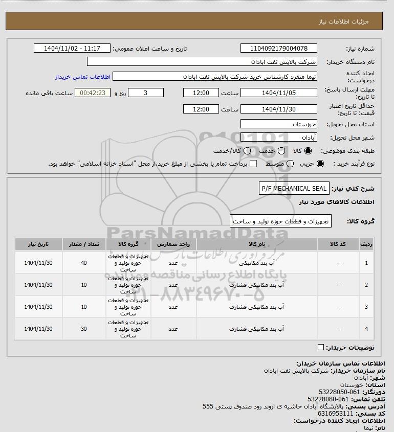 شرح کلی نیاز: P/F MECHANICAL SEAL