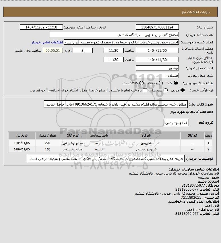 نام دستگاه خریدار:مجتمع گاز پارس جنوبی پالایشگاه ششم