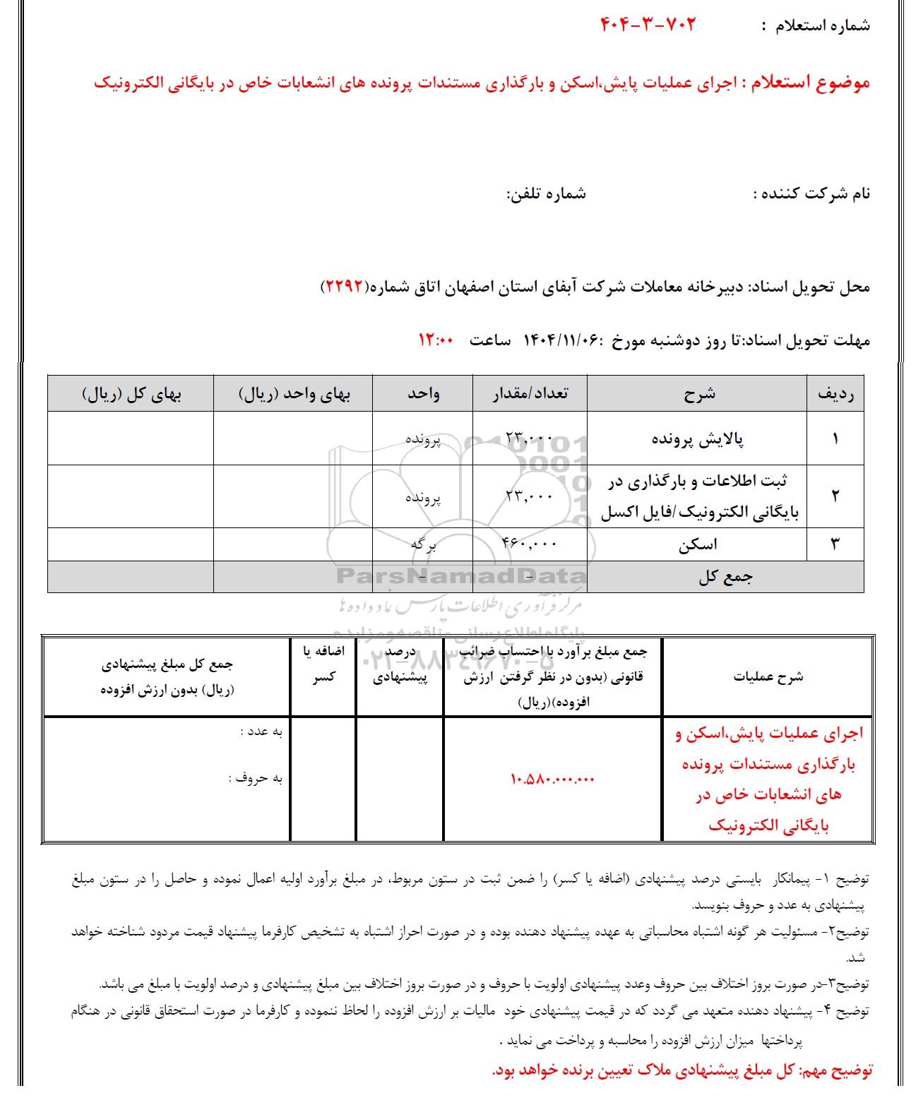 موضوع استعلام : اجرای عملیات پایش، اسکن و بارگذاری مستندات پرونده های انشعابات خاص در بایگانی الکترونیک