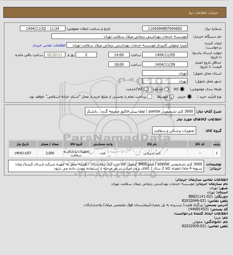شرح کلی نیاز: 3000 کتتر تشخیصی pointer / لطفا پیش فاکتور ضمیمه گردد . باتشکر