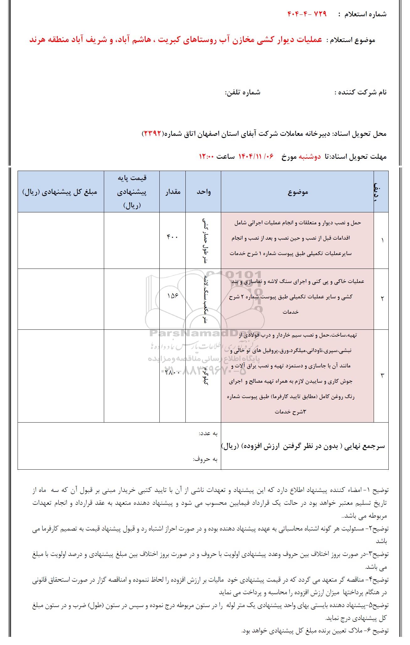 موضوع استعلام: عملیات دیوارکشی مخازن آب روستاهای کبریت، هاشم آباد، شریف آباد منطقه هرند