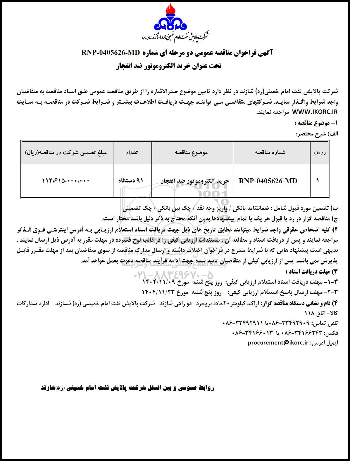 آگهی فراخوان مناقصه عمومی دو مرحله ای شماره RNP - 0405626 - MD