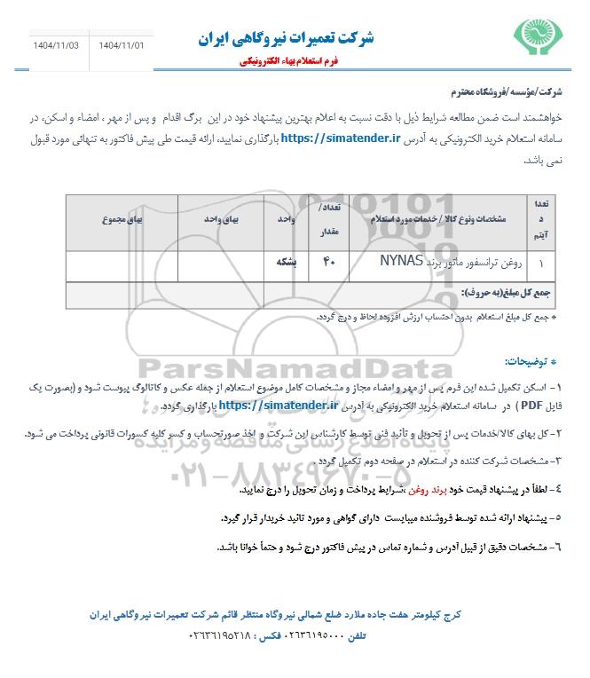 استعلام روغن ترانسفورماتور برند NYNAS, استعلام روغن ترانسفورماتور برند NYNAS