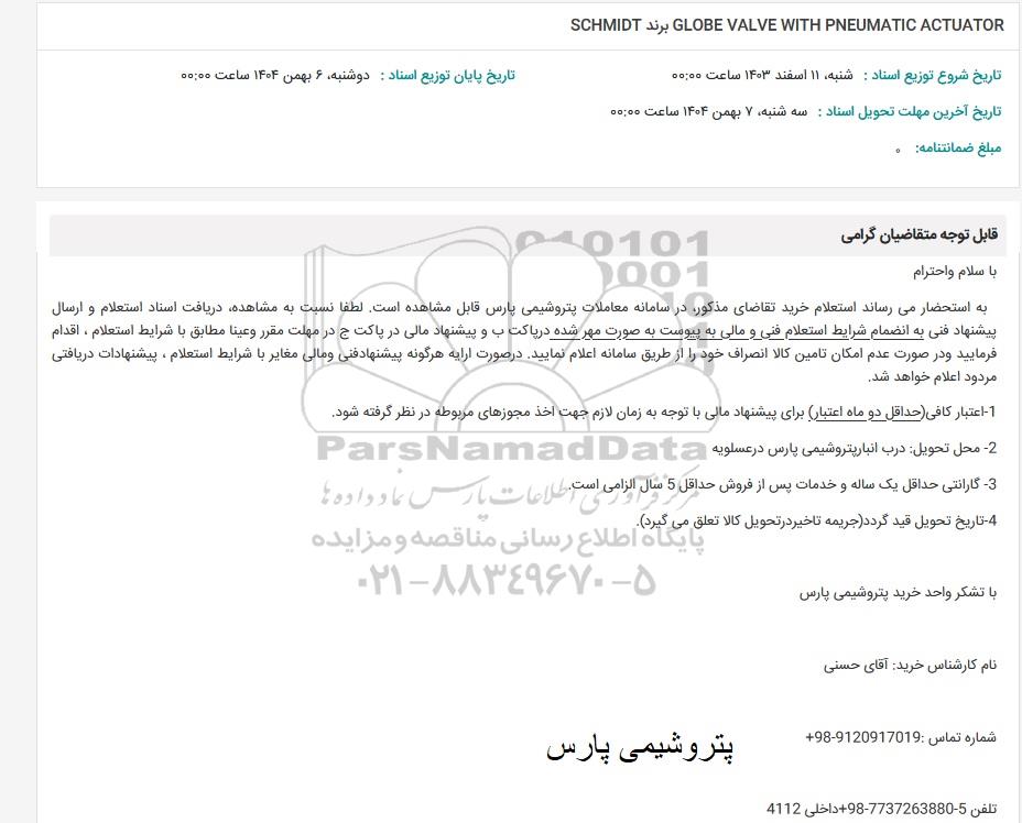 به استحضار می رساند استعلام خرید تقاضای مذکور در سامانه معاملات پتروشیمی پارس قابل مشاهده است. لطفا نسبت به مشاهده دریافت اسناد استعلام و ارسال پیشنهاد فنی به انضمام شرایط استعلام فنی و مالی به پیوست به صورت مهر شده در پاکت ب و پیشنهاد مالی در پاکت ج در مهلت مقرر وعینا مطابق با شرایط استعلام ، اقدام فرمایید و در صورت عدم امکان تامین کالا انصراف خود را از طریق سامانه اعلام نمایید. در صورت ارایه هرگونه پیشنهادفنی و مالی مغایر با شرایط استعلام ، پیشنهادات دریافتی مردود اعلام خواهد شد.