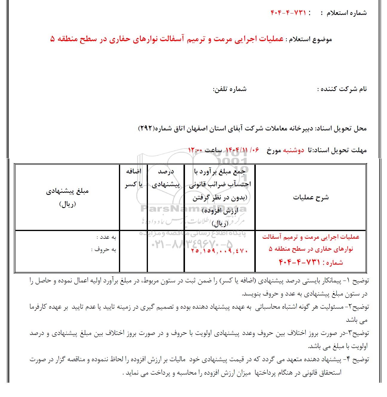موضوع استعلام: عملیات اجرایی مرمت و ترمیم آسفالت نوارهای حفاری در سطح منطقه 5
