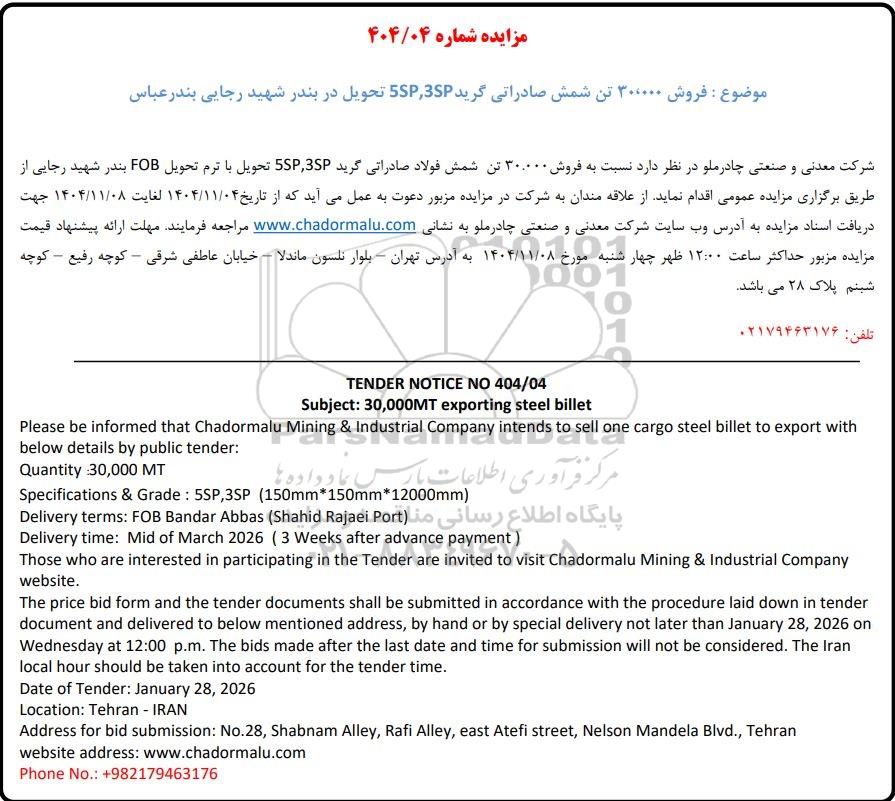 شرکت معدنی و صنعتی چادرملو در نظر دارد نسبت به فروش 30.000 تن شمش فولاد صادراتی گرید 5SP,3SP تحویل با ترم تحویل FOB بندر شهید رجایی از طریق برگزاری مزایده عمومی اقدام نماید. از علاقه مندان به شرکت در مزایده مزبور دعوت به عمل می آید که از تاریخ 1404.11.4 لغایت 1404.11.8 جهت دریافت اسناد مزایده به آدرس وب سایت شرکت معدنی و صنعتی چادرملو به نشانی www.chadormalu.com مراجعه فرمایند مهلت ارائه پیشنهاد قیمت مزایده مزبور حداکثر ساعت 12:00 ظهر 4شنبه مورخ 1404.11.8 به آدرس تهران - بلوار نلسون ماندلا - خیابان عاطفی شرقی - کوچه رفیع - کوچه شبنم پلاک 28 می باشد.
