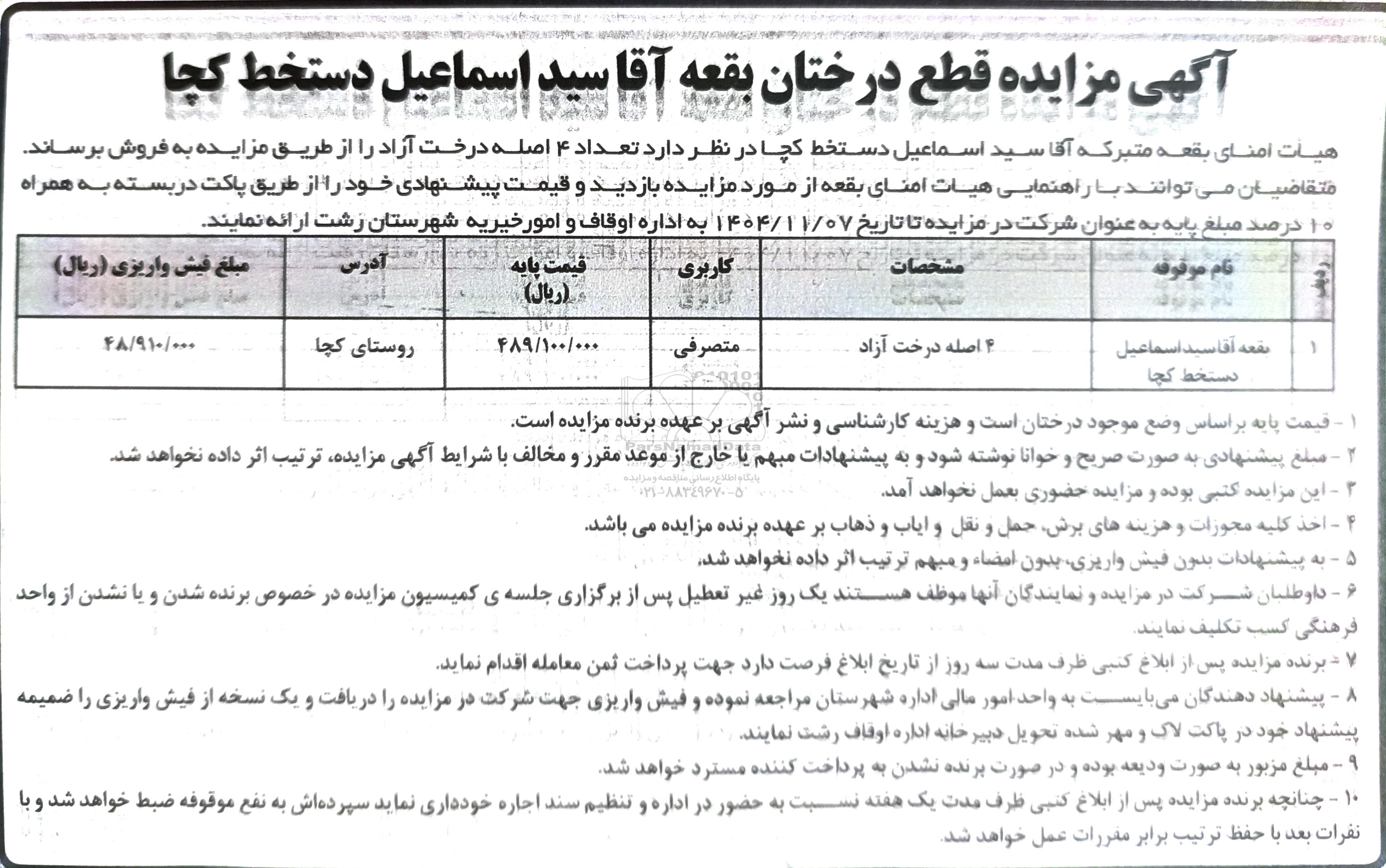 آگهی مزایده قطع درختان بقعه آقا سید اسماعیل دستخط کچا ؟