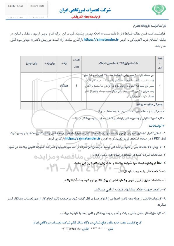 خواهشمند است ضمن مطالعه شرایط ذیل با دقت نسبت به اعلام بهترین پیشنهاد خود در این برگ اقدام و پس از مهر ، امضاء و اسکن در سامانه استعلام خرید الکترونیکی به آدرس https://simatender.ir بارگذاری نمایید ارائه قیمت طی پیش فاکتور به تنهایی مورد قبول نمی باشد.
