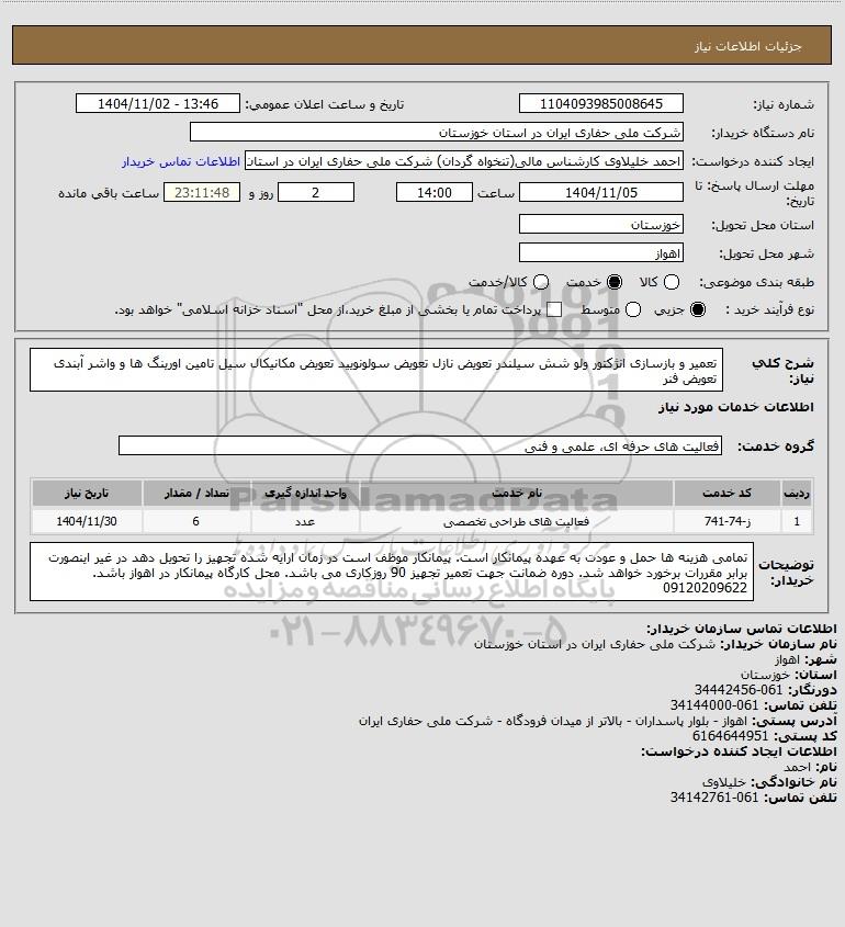 شرح کلی نیاز: تعمیر و بازسازی انژکتور ولو شش سیلندر