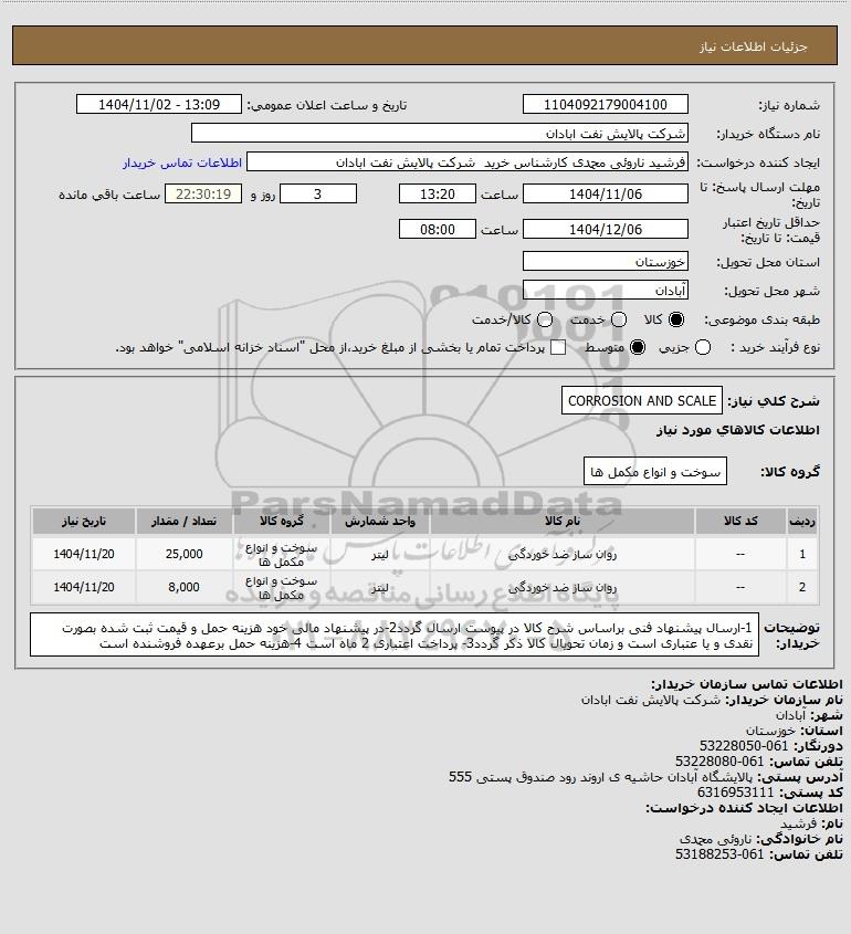 استعلام بها و موضوع استعلام استعلام CORROSION AND SCALE به اطلاع کلیه شرکت‌ها و افراد متخصص واجد شرایط می‌رساند، آگهی گذار در نظر دارد از طریق استعلام بها، نسبت به انتخاب و دریافت پیشنهادات اقدام نماید. این استعلام با کد آگهی ثبت شده در سامانه خبرگزاری پارس نماد : 10176121 منتشر شده است. مشخصات استعلام : تاریخ شروع استعلام: 1404/11/02 آخرین مهلت ارسال پیشنهاد قیمت : 1404/11/06 و محل اجرای پروژه : استان مناقصات استان خوزستان میباشد. استعلام قیمت مورد درخواست : استعلام CORROSION AND SCALE با دسته‌بندی‌های تخصصی و گروه های مرتبط : انواع روغن صنعتی, فرآورده های نفتی, استعلام اطلاع رسانی میگردد.