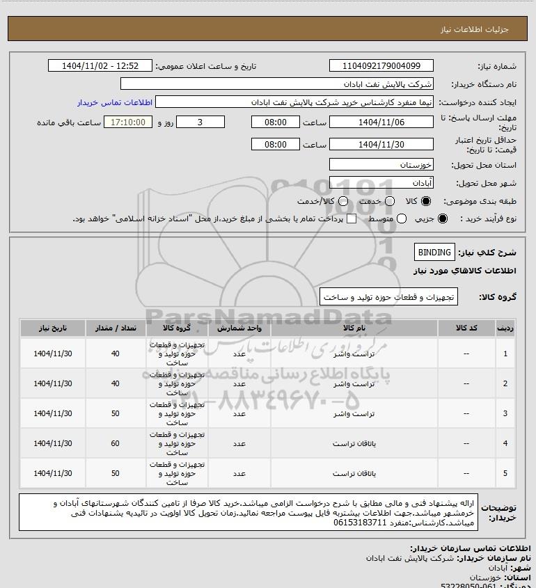 | 3 | -- | تراست واشر | عدد | تجهیزات و قطعات حوزه تولید و ساخت | 50 | 1404/11/30 |