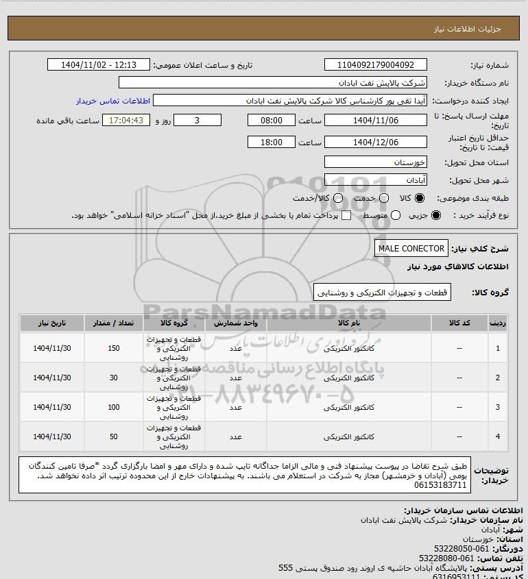 | 4 | -- | کانکتور الکتریکی | عدد | قطعات و تجهیزات الکتریکی و روشنایی | 50 | 1404/11/30 |
