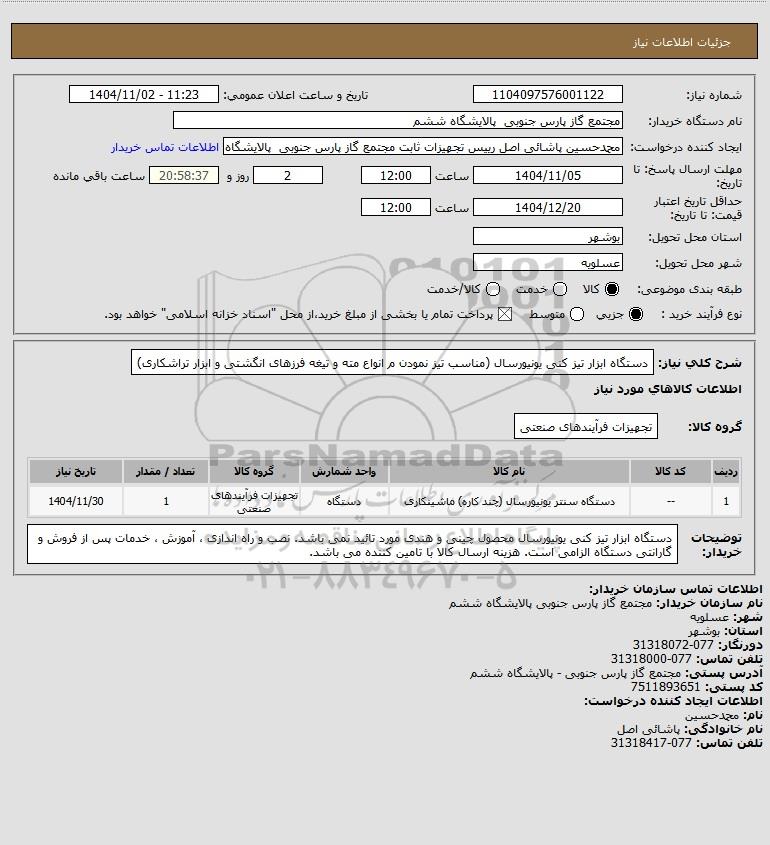 | 1 | -- | دستگاه سنتر یونیورسال (چند کاره) ماشینکاری | دستگاه | تجهیزات فرآیندهای صنعتی | 1 | 1404/11/30 |