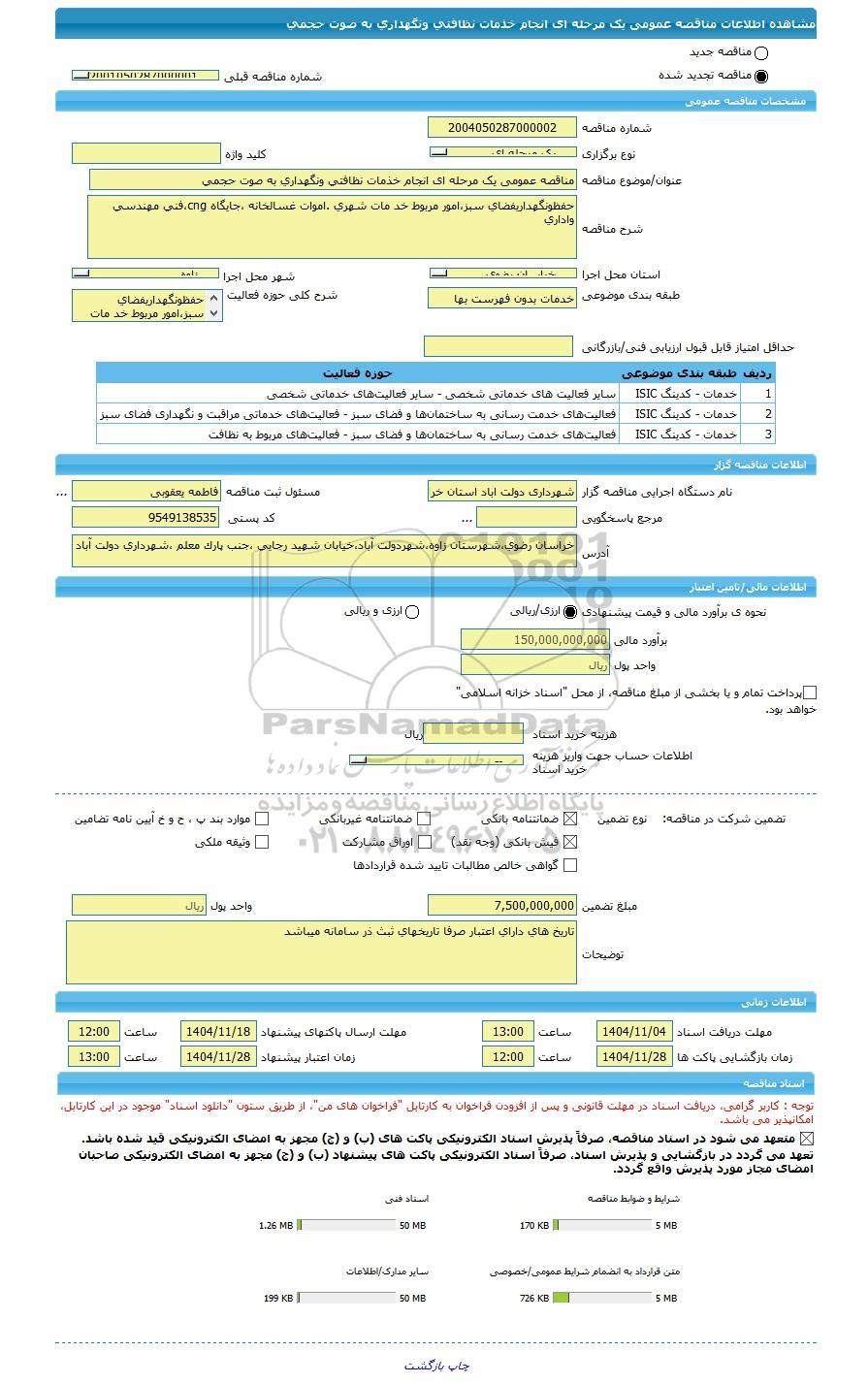 | نام دستگاه اجرایی مناقصه گزار | شهرداری دولت اباد استان خراسان رضوی | مسئول ثبت مناقصه | فاطمه یعقوبی |