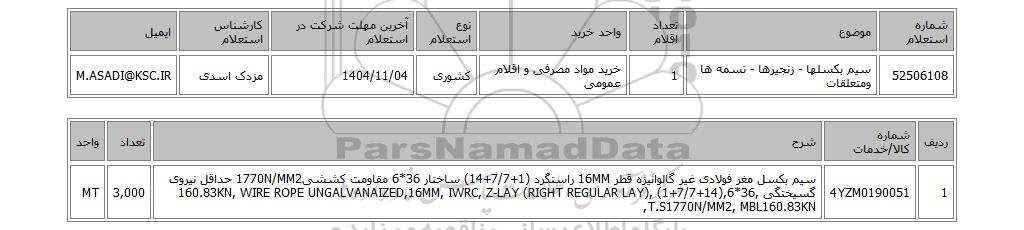 | 1 | 4YZM0190051 | سیم بکسل مغز فولادی غیر گالوانیزه قطر 16MM راستگرد (1+7/7+14) ساختار 36*6 مقاومت کششی1770N/MM2 حداقل نیروی گسیختگی 160.83KN, WIRE ROPE UNGALVANAIZED,16MM, IWRC, Z-LAY (RIGHT REGULAR LAY), (1+7/7+14),6*36, T.S1770N/MM2, MBL160.83KN, | 3,000 | MT |
