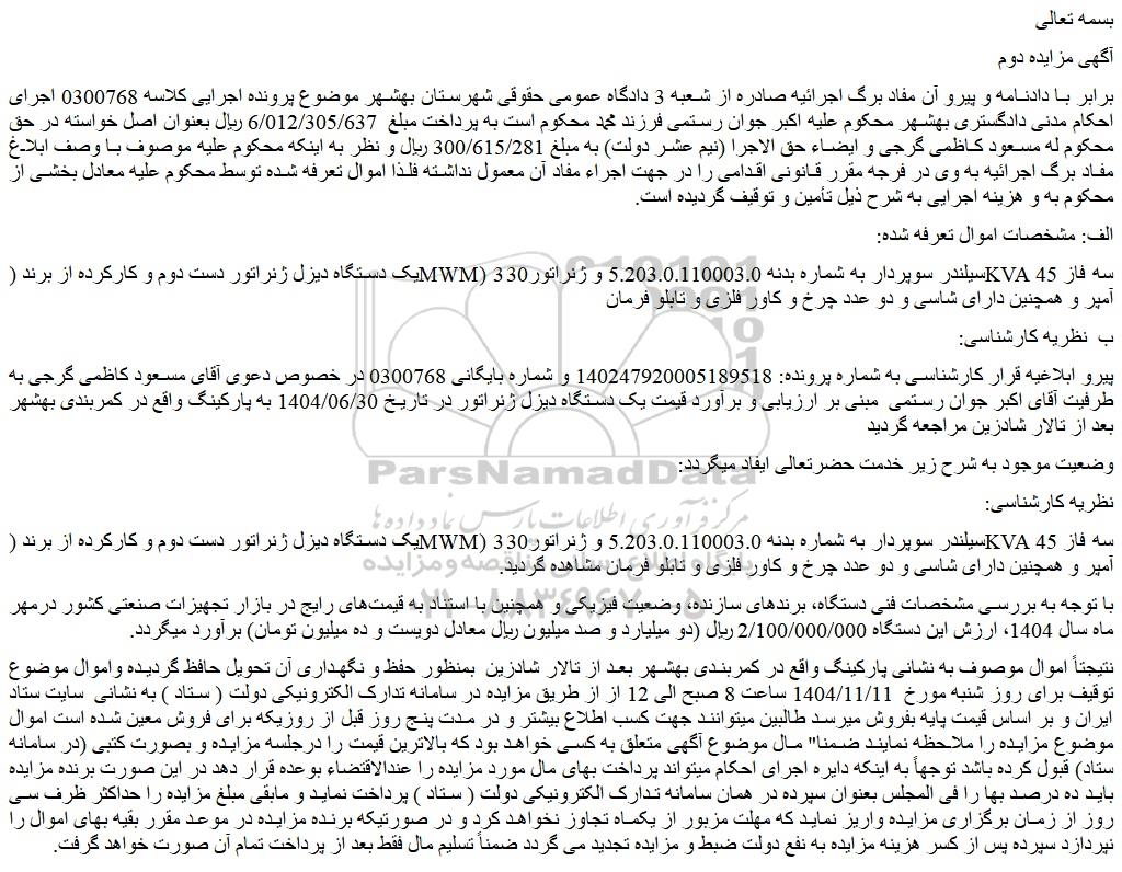 پیرو ابلاغیه قرار کارشناسی به شماره پرونده: 140247920005189518 و شماره بایگانی 0300768 در خصوص دعوی آقای مسعود کاظمی گرجی به طرفیت آقای اکبر جوان رستمی مبنی بر ارزیابی و برآورد قیمت یک دستگاه دیزل ژنراتور در تاریخ 1404/06/30 به پارکینگ واقع در کمربندی بهشهر بعد از تالار شادزین مراجعه گردید
