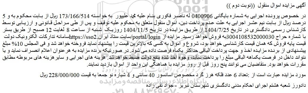 در خصوص پرونده اجرایی به شماره بایگانی 0400906 له ناصر فکوری بنام علیه محمد علیپور  به خواسته 173/166/514 ریال از بابت محکوم به و 5 درصد ریال از بابت نیم عشر اجرایی به علت عدم پرداخت دین، اموال منقول متعلق به محکوم علیه توقیف و پس از طی مـراحـل قانونی و ارزیابی توسط کارشناس رسمی دادگستری در تاریخ 1404/7/25 از طریق مزایده در تاریخ 1404/11/5 روزیک  شنبه از ساعت 8 لغایت 12 صبح از طریق بستر سامانه تدارکات الکترونیک دولت سایت ستاد ایران با شماره حراج 3004108532000030به فروش خواهد رسید. مزایده از قیمت پایه فروش که همان قیمت کارشناسی خواهد بود، شروع و اموال به کسی که بالاترین قیمت را پیشنهاد نماید فروخته خواهد شد و فی المجلس 10% مبلغ پیشنهادی از برنده مزایده اخذ و جهت پرداخت الباقی حداکثر یکماه فرصت داده می شود. در صورتیکه برنده مزایده به هرعنوان اعلام انصراف نماید و یا نتواند داخل در فرصت یکماهه الباقی مبلغ را پرداخت نماید، وجوه اخذ شده بنفع دولت ضبط خواهد شد. هزینه های اجرایی و سایرهزینه های مربوطه مطابق مقررات خواهد بود. متقاضیان می توانند پنج روز قبل از روز مزایده با هماهنگی این واحد از اموال بازدید نمایند.