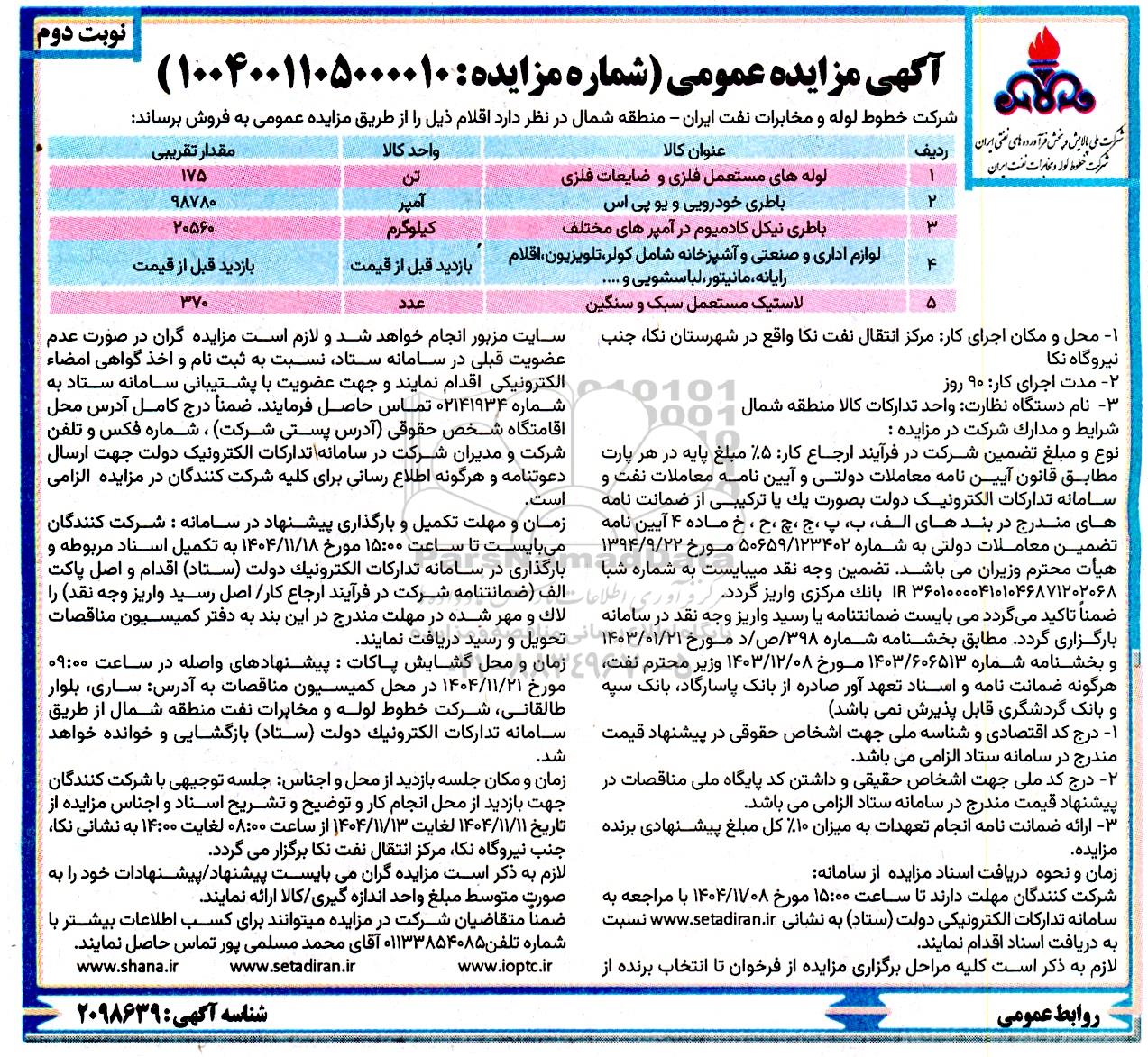 شرکت خطوط لوله و مخابرات نفت ایران منطقه شمال در نظر دارد اقلام ذیل را از طریق مزایده عمومی به فروش برساند.