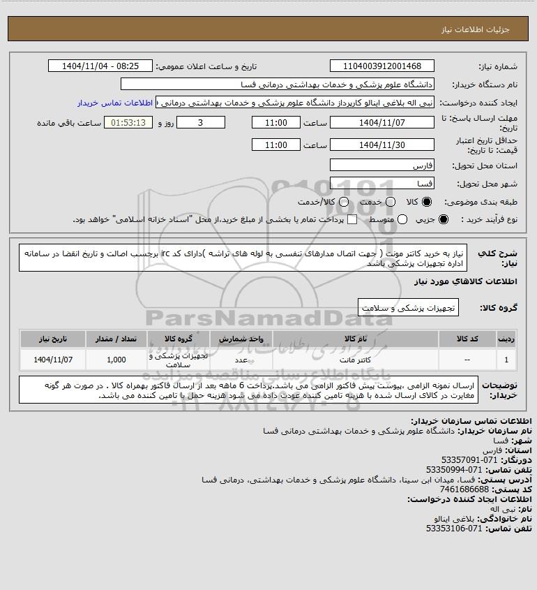 | 1 | -- | کاتتر مانت | عدد | تجهیزات پزشکی و سلامت | 1,000 | 1404/11/07 |