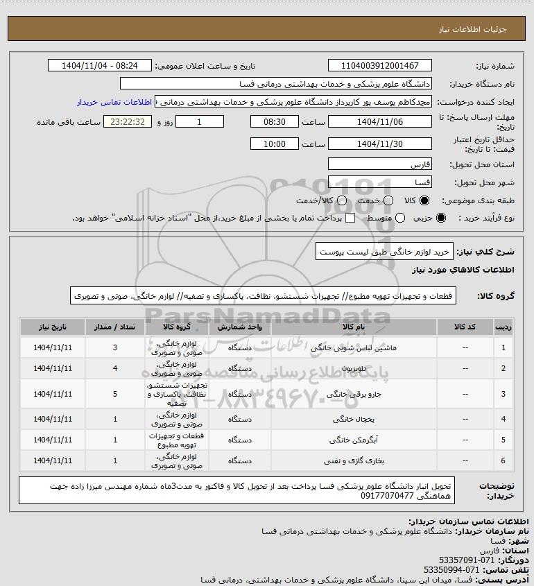 شرح کلی نیاز: خرید لوازم خانگی طبق لیست پیوست