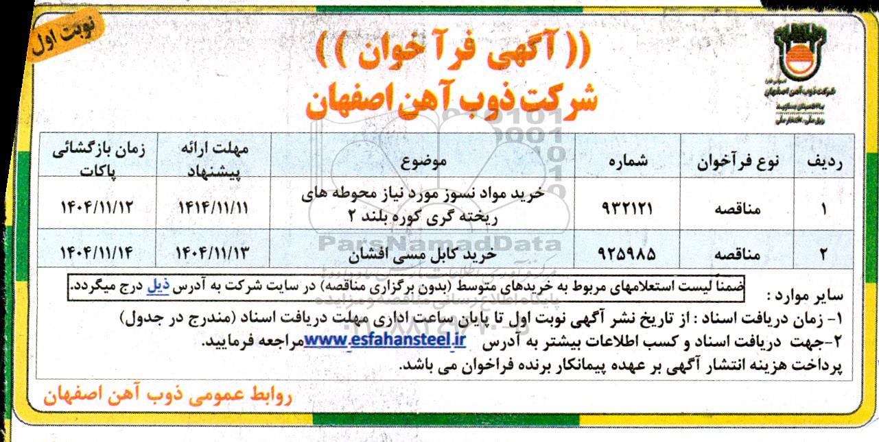 فراخوان خرید مواد نسوز موردنیاز محوطه های ریخته گری از کلیه افراد متخصص و شرکتها واجد شرایط دعوت به عمل میآید در مناقصه با کد خبرگزاری پارس نماد: 10178332 شرکت نمایند.