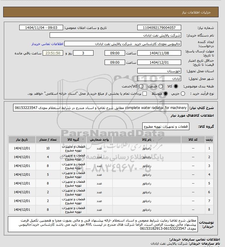 استعلام complete water radiator for machinery مطابق شرح تقاضا و اسناد مندرج در شرایط استعلام محمدی 06153223547, استعلام complete water radiator for machinery مطابق شرح تقاضا و اسناد مندرج در شرایط استعلام محمدی 06153223547