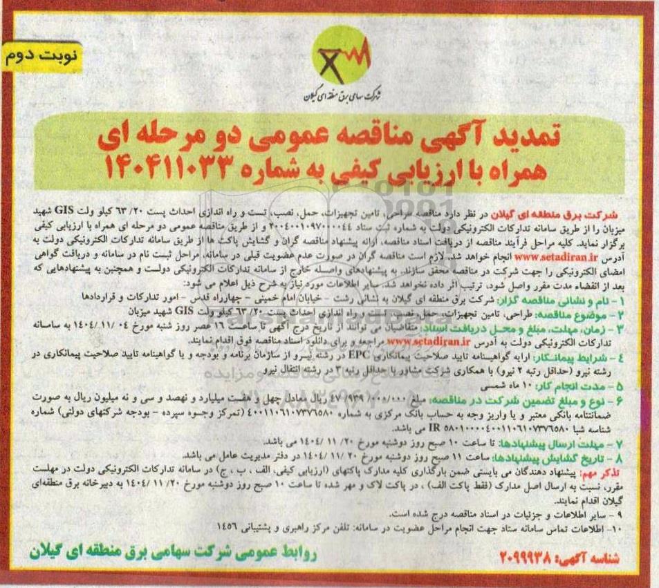 تمدید آگهی مناقصه عمومی دو مرحله ای همراه با ارزیابی کیفی به شماره 140411033 ؟ نوبت دوم