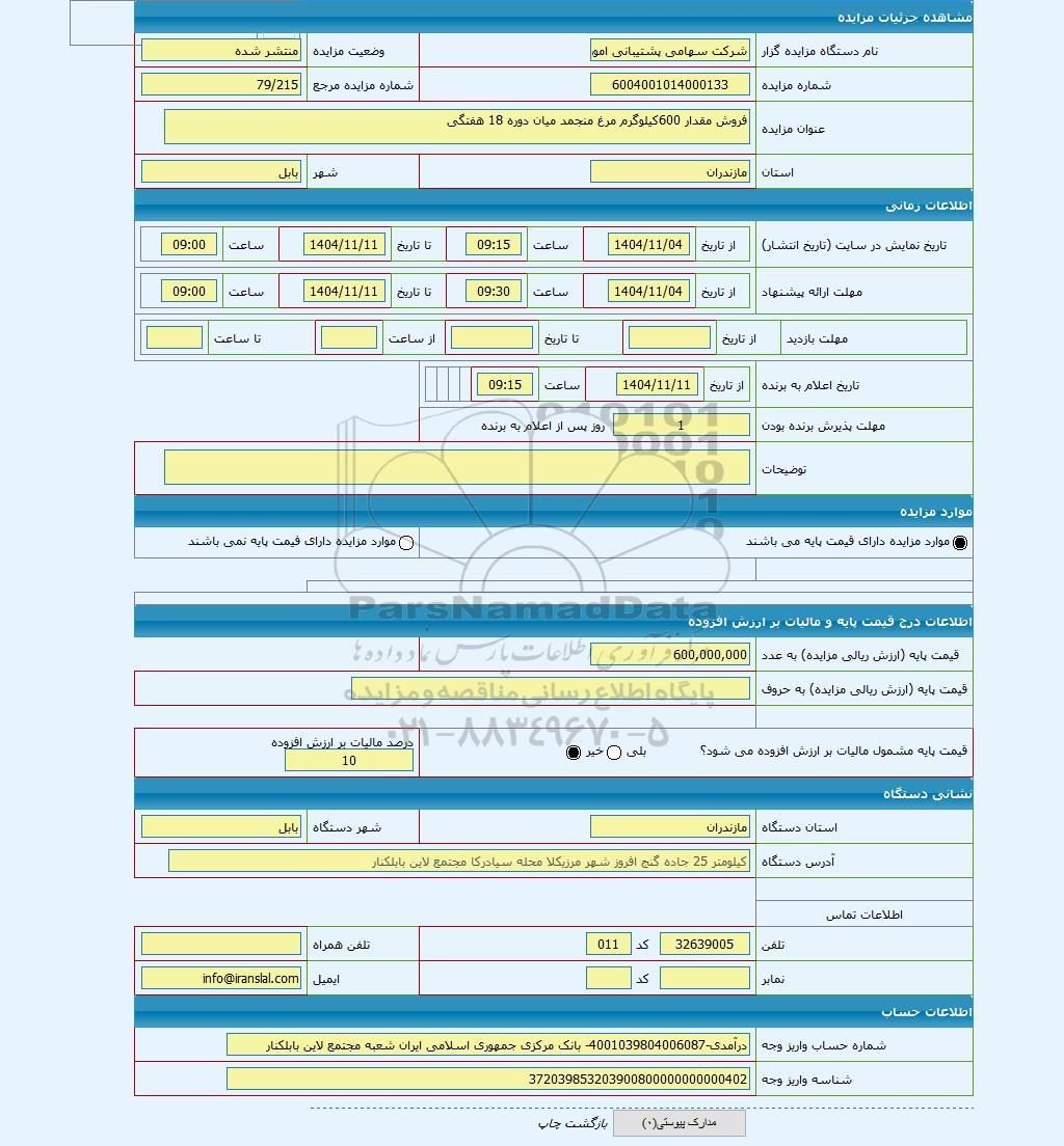 مزایده عمومی مزایده فروش مقدار 600کیلوگرم مرغ منجمد میان دوره 18 هفتگی برگزار میگردد. از کلیه افراد متخصص و شرکتهای واجد شرایط دعوت به عمل میآید تا در این مزایده با کد خبرگزاری پارس نماد : 10179254 شرکت نمایند تاریخ شروع مزایده : 1404/11/04 مهلت شرکت در مزایده: تا پایان روز 1404/11/11 مکان برگزاری اموال واگذاری استانهای مزایدات استان مازندران و دستهبندیهای مربوط به این حراجی مواد غذایی و خشکبار میباشد.