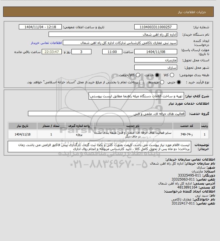 استعلام بها و موضوع استعلام استعلام تهیه و ساخت قطعات دستگاه میله راهنما مطابق لیست پیوستی به اطلاع کلیه شرکتها و افراد متخصص واجد شرایط میرساند، آگهی گذار در نظر دارد از طریق استعلام بها، نسبت به انتخاب و دریافت پیشنهادات اقدام نماید. این استعلام با کد آگهی ثبت شده در سامانه خبرگزاری پارس نماد : 10180479 منتشر شده است. مشخصات استعلام : تاریخ شروع استعلام: 1404/11/04 آخرین مهلت ارسال پیشنهاد قیمت : 1404/11/08 و محل اجرای پروژه : استان مناقصات استان مازندران میباشد. استعلام قیمت مورد درخواست : استعلام تهیه و ساخت قطعات دستگاه میله راهنما مطابق لیست پیوستی با دستهبندیهای تخصصی و گروه های مرتبط : سیستم های حفاظتی-دوربین مدار بسته،دزدگیر،آیفون تصویری و آنتن مرکزی, راه آهن, سیستم ایمنی ، اتش نشانی،اعلام و اطفای حریق, قطعات چدنی و فولادی, دکل و بی سیم, بوژی واگن, تجهیزات برق و الکترونیک, استعلام اطلاع رسانی میگردد.