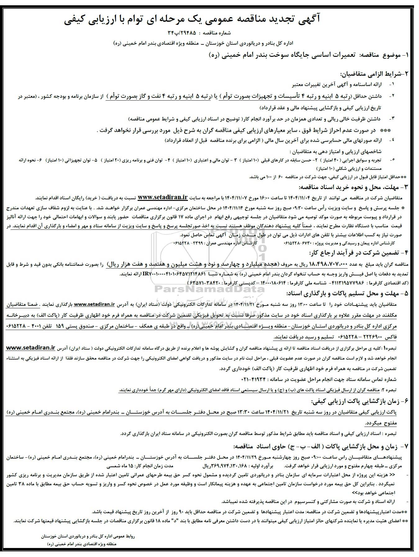 پیشنهادهای متقاضیان راس ساعت 09:00 صبح روز چهارشنبه مورخ 1404.11.29 در محل دفتر جلسات به آدرس خوزستان - بندرامام خمینی (ره) مجتمع بندری امام خمینی (ره) - ساختمان مرکزی - طبقه چهارم مفتوح و مورد ارزیابی قرار خواهد گرفت. برآورد اولیه : 369.974.130.168 ریال