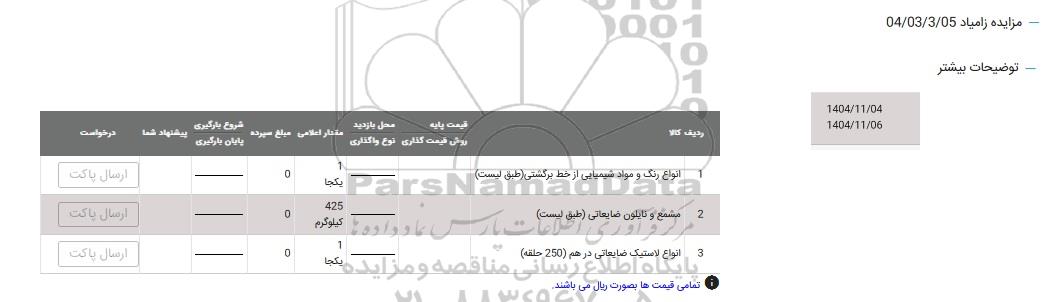 | 1 | انواع رنگ و مواد شیمیایی از خط برگشتی (طبق لیست) | ------ | 1 یکجا | 0 |