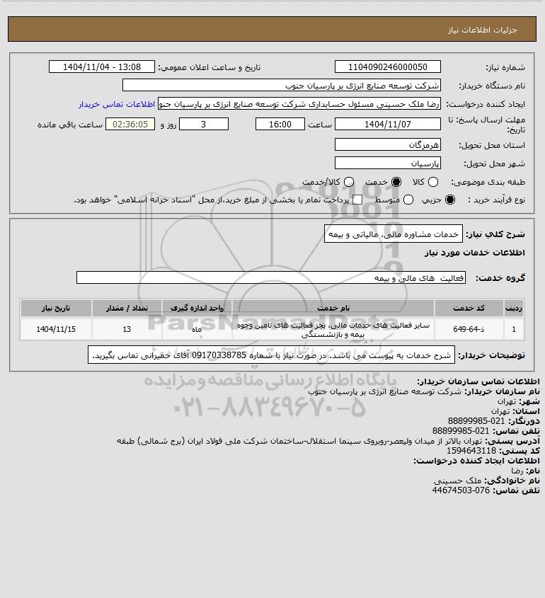 شرح کلی نیاز: خدمات مشاوره مالی، مالیاتی و بیمه