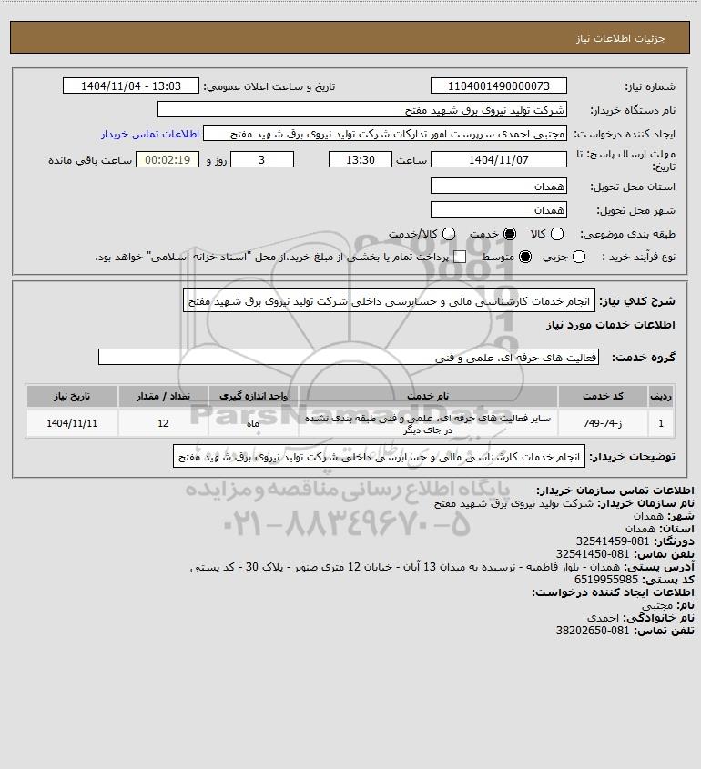 شرح کلی نیاز: انجام خدمات کارشناسی مالی و حسابرسی داخلی شرکت تولید نیروی برق شهید مفتح