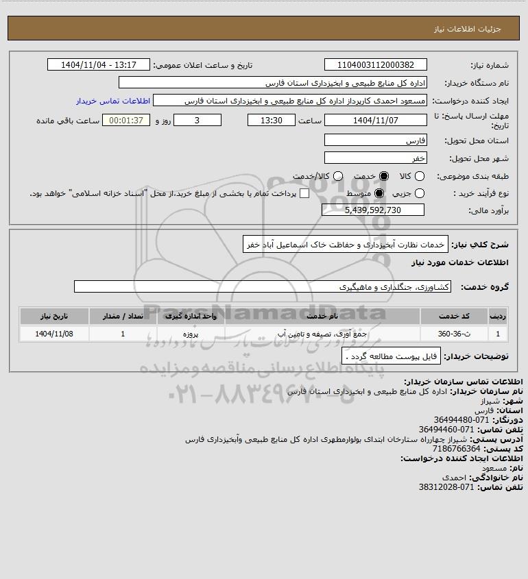 شرح کلی نیاز: خدمات نظارت آبخیزداری و حفاظت خاک اسماعیل آباد خفر