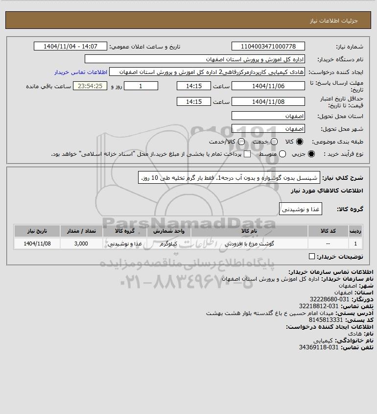 | 1 | -- | گوشت مرغ با افزودنی | کیلوگرم | غذا و نوشیدنی | 3,000 | 1404/11/08 |