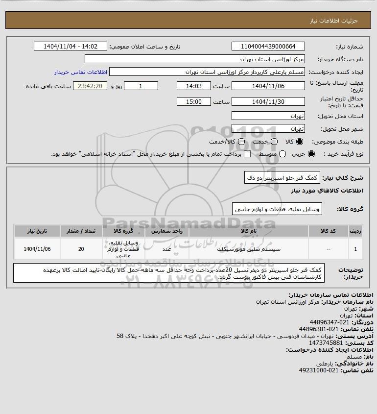 استعلام بها و موضوع استعلام استعلام کمک فنر جلو اسپرینتر دو دف به اطلاع کلیه شرکتها و افراد متخصص واجد شرایط میرساند، آگهی گذار در نظر دارد از طریق استعلام بها، نسبت به انتخاب و دریافت پیشنهادات اقدام نماید. این استعلام با کد آگهی ثبت شده در سامانه خبرگزاری پارس نماد : 10181602 منتشر شده است. مشخصات استعلام : تاریخ شروع استعلام: 1404/11/04 آخرین مهلت ارسال پیشنهاد قیمت : 1404/11/06 و محل اجرای پروژه : استان مناقصات استان تهران میباشد. استعلام قیمت مورد درخواست : استعلام کمک فنر جلو اسپرینتر دو دف با دستهبندیهای تخصصی و گروه های مرتبط : انواع فنر, قطعات خودرو, استعلام اطلاع رسانی میگردد.
