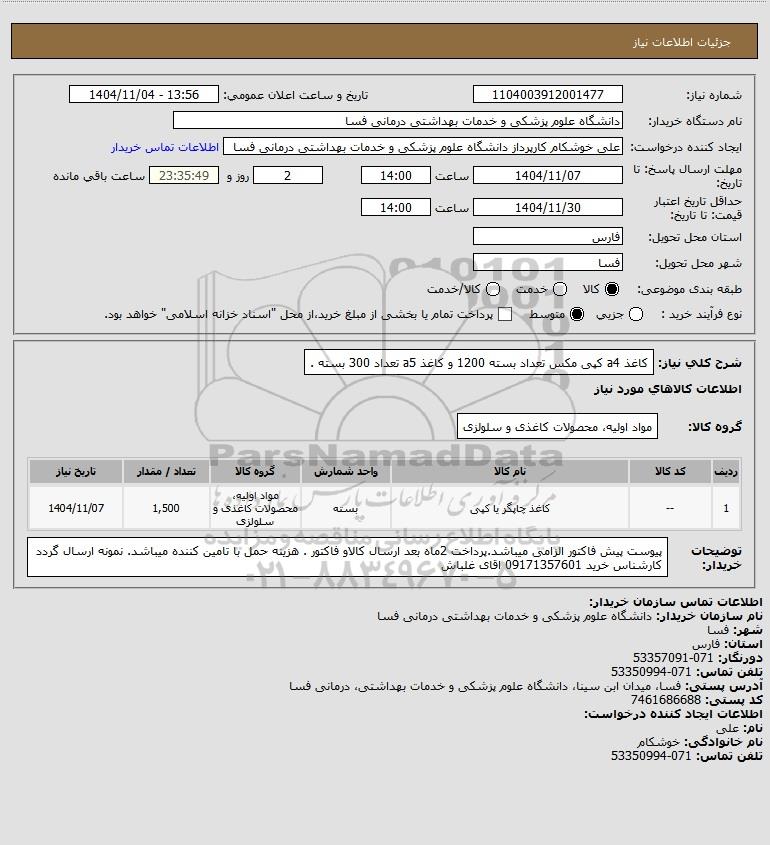 شرح کلی نیاز: کاغذ a4 کپی مکس تعداد بسته 1200 و کاغذ a5 تعداد 300 بسته .