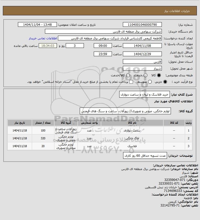 شرح کلی نیاز: خرید فلاسک و لیوان و ساعت دیواری