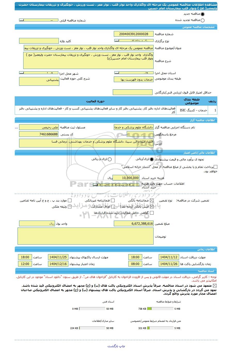 شرح مناقصهواگذاری واحد نوار قلب ، نوار مغز ، تست ورزش ، خونگیری و تزریقات بیمارستان حضرت ولیعصر( عج ) ونوار قلب بیمارستان امام حسین(ع)